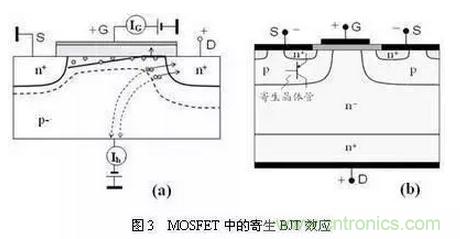 ③对于VDMOSFET:观察图3(b)中的结构,即可见到,当器件正向导通时,其中存在一个工作于放大状态的寄生n-p-n晶体管(n+源区是发射区,n-外延层是集电区,p沟道是基区)。该寄生晶体管的可能导电通道是与MOSFET的ID相并联的,故在VDMOSFET工作时,必须要注意防止寄生晶体管导通;否则,寄生晶体管的导通就可能引起二次击穿,使得功率MOSFET完全失去功能。