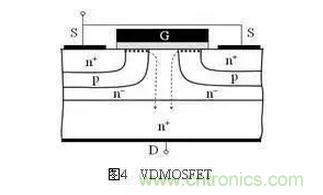 【答】如图4所示,源-漏电流是从芯片表面向下流动的,并在电流通路的两侧是pn结,因此这种电流输运的过程,从工作原理上来看,就相当于是一个寄生JFET。从而可以把VDMOSFET等效为一个MOSFET与一个寄生JFET的串联组合,其中很大部分n-漂移区就相当于是寄生JFET的沟道。