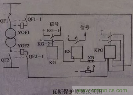 变压器瓦斯保护的主要元件就是瓦斯继电器,它安装在油箱与油枕之间的连接管中。当变压器发生内部故障时,因油的膨胀和所产生的瓦斯气体沿连接管经瓦斯继电器向油枕中流动。若流动的速度达到一定值时,瓦斯继电器内部的挡板被冲动,并向一方倾斜,使瓦斯继电器的触点闭合,接通跳闸回路或发出信号,如图所示:瓦斯继电器KG的上触点接至信号,为轻瓦斯?;?;下触点为重瓦斯?;ぃ藕偶痰缙鱇S、连接片XE起动出口中间继电器KOM,KOM的两对触点闭合后,分别使断路器QF1、QF2、跳闸线圈励磁。跳开变压器两侧断路器,即: