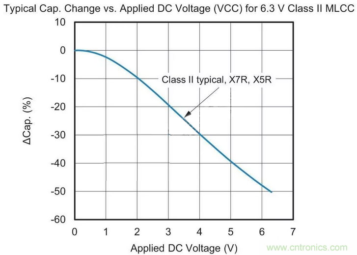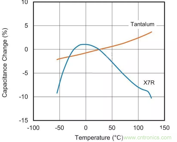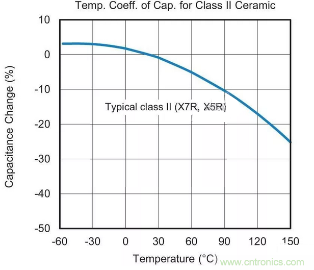 用于替换最可能的MLCC候选者采用“II类”电介质材料。这种II类陶瓷(通常为X7R或X5R)的容值会在温度范围内变化,这种特征称为电容温度系数(TCC),参见图1。