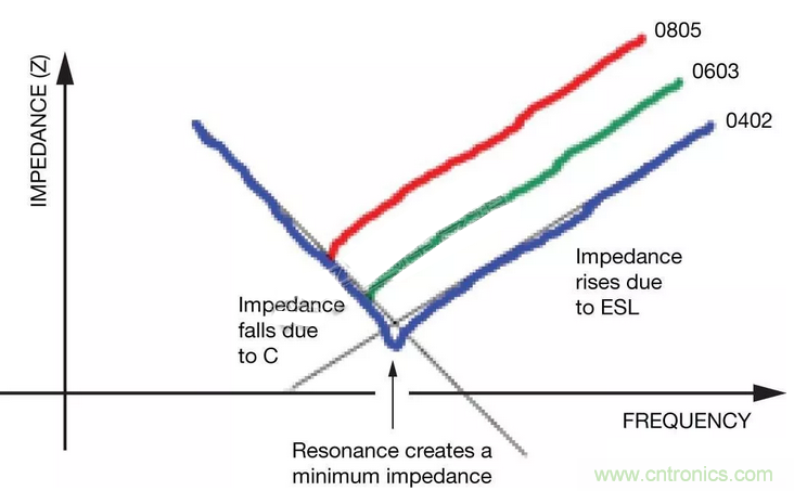 高速电路是一个例外,其中的感应负载可能会延迟传送来自电容的所需电流,从而影响电路性能。阻抗(Z)的影响因外壳尺寸而有不同,如图4所示。