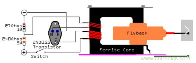 我们可以采用单管自激推高压包的方法来产生高压。我们使用一个2N3055三极管。