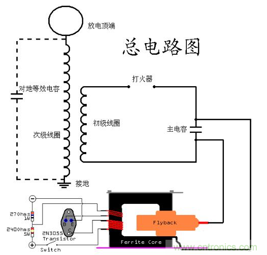 SGTC的原理就是先给电容充电,电容的电压达到一定程度时,在打火器出放出电弧,形成一个回路,然后放电,之后重新开始这个循环。