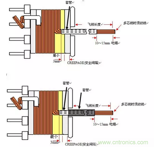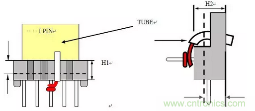 ④变压器中有加铁氟龙套且有折回线时,其出入线所加之铁氟龙套管须与 骨架的凹槽口齐平(或至少达2/3高),并自骨架的凹槽出线以防止因套管过长造成拉力将线扯断。但若为L形引脚水平方向缠线,则套管应与 骨架边齐平(或至少2/3长),如图7所示。