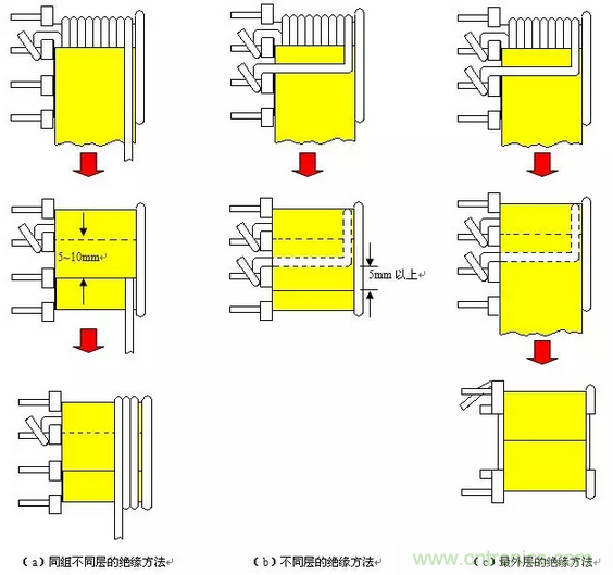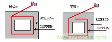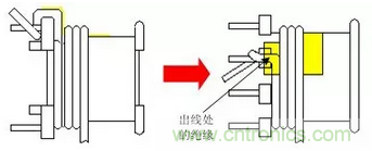 1)铜箔绕法除焊点处必须压平外铜箔之起绕边应避免压在骨架转角处,须自骨架的中央处起绕,以防止第二层铜箔与第一层间因挤压刺破胶布而形成短路,如图11所示。
