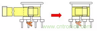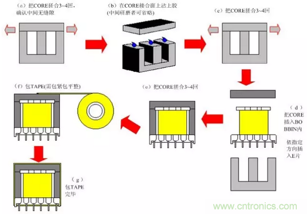 4)铁心固定方式可以铁夹(CLIP)或三层胶布方式固定,且可在铁心接合处点环氧树脂胶(EPOXY)固定,点胶后须阴干半小时再置于120℃烤箱中烘烤一小时。包铁心的固定胶布须使用与线包颜色相同的胶布(图面特殊要求除外),厂家需符合UL规格。组装过程如图21所示。
