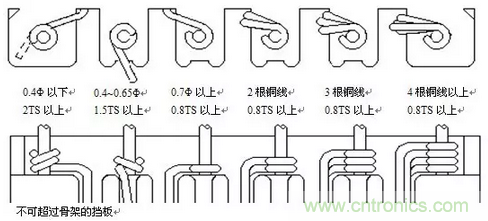 ②出入线于使用,骨架的凹槽出线时,原则上以一线一凹槽方式出线,若同一引脚有多组可使用同一凹槽或相邻的凹槽出线,唯在焊锡及装套管时要注意避免短路。