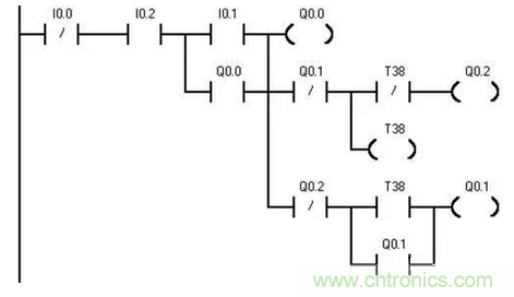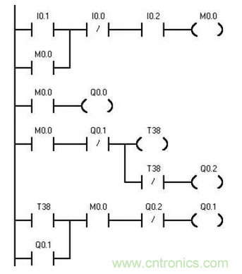 转换后的梯形图程序如图2所示。按照梯形图语言中的语法规定简化和修改梯形图。为了简化电路,当多个线圈都受某一串并联电路控制时,可在梯形图中设置该电路控制的存储器的位,如M0.0。简化后的程序如图3-所示。
