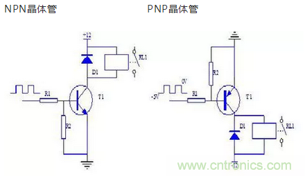 NPN晶体管驱动时:当晶体管T1基极被输入高电平时,晶体管饱和导通,集电极变为低电平,因此继电器线圈通电,触点RL1吸合。