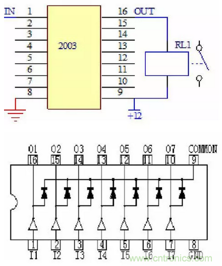 根据集成电路驱动器2003的输入输出特性,有人把它简称叫“驱动器”“反向器”“放大器”等,现在常用型号为:TD62003AP。当2003输入端为高电平时,对应的输出口输出低电平,继电器线圈通电,继电器触点吸合;当2003输入端为低电平时,继电器线圈断电,继电器触点断开;在2003内部已集成起反向续流作用的二极管,因此可直接用它驱动继电器。