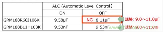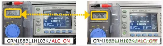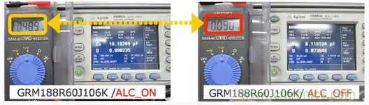 大容量和非大容量MLCC在ALC (Automatic Level Control )ON/OFF的状态下测定静电容量。结果如下。