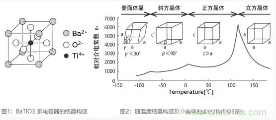 BaTiO3系陶瓷电容器加热到居里点以上时,结晶构造由正方晶系转变成立方晶系。冷却到居里点温度以下时,结晶构造由立方晶系转变成正方晶系。(图2)