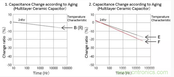 高诱电系的积层陶瓷电容器的静电容量,以经过125℃以上的热处理24小时后的值作为基准,与时间成对数关系直线性下降。请参考如下本公司制品静电容量老化特性的代表例子。