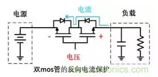 如下图所示,这是使用2个MOS管串联的方法。在MOS管关闭时,可以阻止从两个方向上來的电流。 MOS管的压降低于二极管解决方案,但这种方法的缺点是需要占用更多的电路板空间。