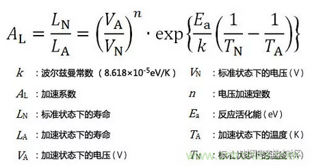 下面的加速公式是基于阿列纽斯法,利用电压加速系数(※1)及反应活化能(※2)推算。