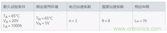 在此公式的基础上,通过在更为严苛的条件(更高温、更高电压)下进行加速试验,可推算出产品在实际使用环境下的使用寿命。