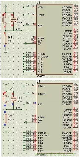 大家可以看到复位电路中电阻R1=10k时RST是高电平 ,而当R1=50时RST为低电平,很明显R1=10k时是错误的,单片机一直处在复位状态时根本无法工作。出现这样的原因是由于RST引脚内含三极管,即便在截止状态时也会有少量截止电流,当R取的非常大时,微弱的截止电流通过就产生了高电平。