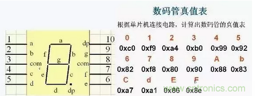 数码管点亮形成的数字由a,b,c,d,e,f,e,dp(小数点)构成,字模及真值表如上图。