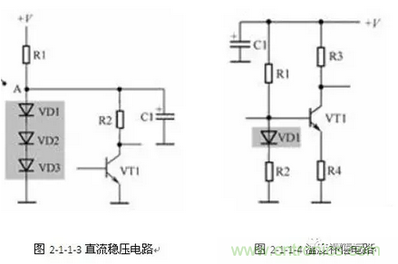 二极管简易稳压电路中主要利用二极管的管压降基本不变特性。二极管的管压降特性:二极管导通后其管压降基本不变,对硅二极管而言这一管压降是0.6V左右,对锗二极管而言是0.2V左右。上图所示是由普通3只二极管构成的简易直流稳压电路。电路中的VD1、VD2和VD3是普通二极管,它们串联起来后构成一个简易直流电压稳压电路。图2-1-1-3.