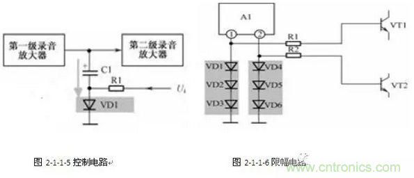 二极管导通之后,它的正向电阻大小随电流大小变化而有微小改变,正向电流愈大,正向电阻愈??;反之则大。利用二极管正向电流与正向电阻之间的特性,可以构成一些自动控制电路。如图9-43所示是一种由二极管构成的自动控制电路,又称ALC电路(自动电平控制电路),它在磁性录音设备中(如卡座)的录音电路中经常应用。图2-1-1-5。