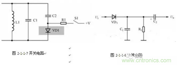 图所示是二极管检波电路。电路中的VD1是检波二极管,C1是高频滤波电容,R1是检波电路的负载电阻,C2是耦合电容。图2-1-1-8。