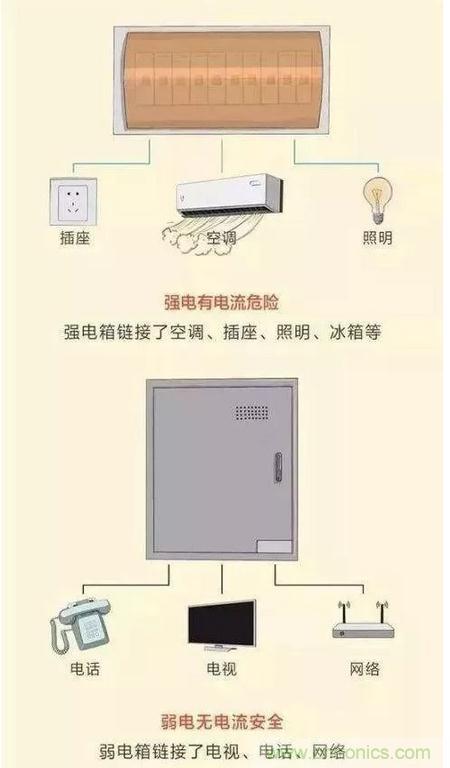其中的强电是存在电流危险的,主要包括有空调、插座、照明、冰箱等;而弱电是没有电流安全的,涵盖了电视、电话、网络。