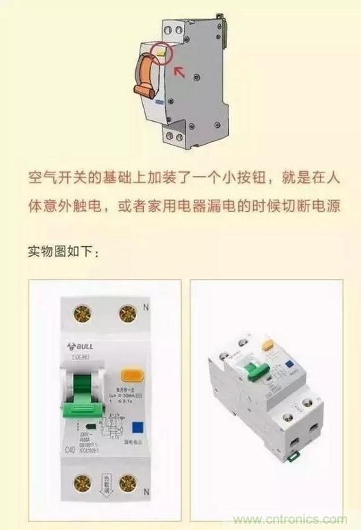 漏电断路器是在空气开关的基础上添加的一个小按钮,当发生意外漏电的时候,会引发开关自动切断电源。
