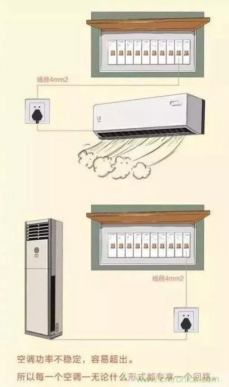 家装中的空调一般都是单独的线路,因为空调功率经常不稳定,容易出现超载的可能,因此每个可调都配有一个回路。