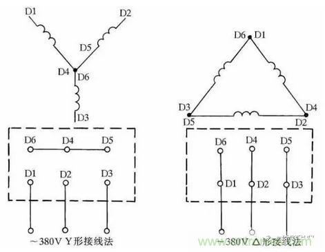 一般常用三相交流电动机接线架上都引出6个接线柱,当电动机铭牌上标为Y形接法时,D6、D4、D5相连接,D1~D3接电源;为△形接法时,D6与D1连接,D4与D2连接,D5与D3连接,然后D1~D3接电源??刹渭?所示连接方法连接。