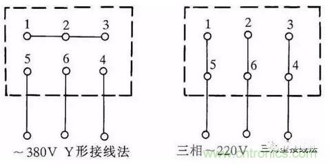 有部分三相吹风机有6个接线端子,接线方法如图2所示。采用△形接法应接入220V三相交流电源,采用Y形接法应接入380V三相交流电源。一般3英寸、3.5英寸、4英寸、4.5英寸的型号按此法接。其他吹风机应按其铭牌上所标的接法连接。