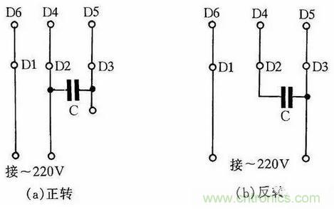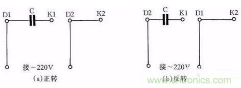图4是JX07A-4型单相电容运转电动机接线方法。电动机功率为60W,用220V/50Hz交流电源、电流为0.5A。它的转速为每分钟1400转。电容选用耐压400~500V、容量8μF的产品。图4(a)为正转接线,图4(b)为反转接线。