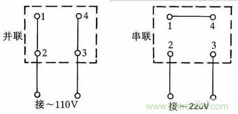 有的单相吹风机引出4个接线端子,接线方法如图5所示。采用并联接法应接入110V交流电源,采用串联接法应接入220V交流电源。
