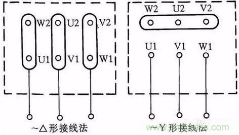 目前,Y系列电动机被广泛应用。Y系列电动机具有体积小、外形美观、节电等优点。它的接线方式有两种:一种为△形,它的接线端子W2与U1相连,U2与V1相连,V2与W1相连,然后接电源;另一种为Y形,接线端子W2、U2、V2相连接,其余3个接线端子U1、V1、W1接电源。接线见图6。