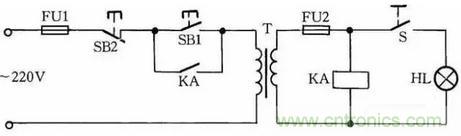 工作原理:闭合S后,按下按钮SB1,变压器得电输出36V低电压,使得继电器或交流接触器KA吸合。放松按钮SB1后,KA自锁触点使KA保持吸合,继续给变压器接通电源。如果变压器次级发生短路故障,继电器线圈电压为零,此时KA便失电释放,将变压器电源断开,?;け溲蛊鞑槐黄苹?。