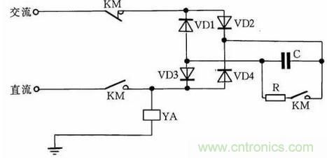 直流电磁铁停电后,因有剩磁存在,有时会造成不良后果。因此,必须设法消除剩磁。图9中,YA是直流电磁铁线圈,KM是控制YA启停的接触器。KM吸合时,YA通电励磁;KM复位时,YA断直流电,并进行快速退磁。
