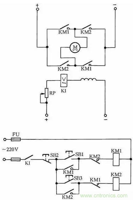 在励磁电路内,串联一个欠电流继电器KI,其??サ憬釉诳刂频缏分小5崩诺缌飨Щ蚣跣〉缴瓒ㄖ凳?,KI释放,KI??サ愣峡?,切断电动机电枢电源,使电动机停转,从而避免超速现象发生,见图11。