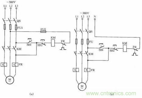 接触器线圈电压为380V时,可按图12(a)所示接线;接触器线圈电压为220V时,可按图12(b)接线。图12(a)的接线还有缺陷,即在电动机停转时,其引出线及电动机带电,使维修不大安全。因此,这种线路只能在应急时采用,并在维修电动机时,应断开控制电动机的总电源开关QS,这一点应特别注意。