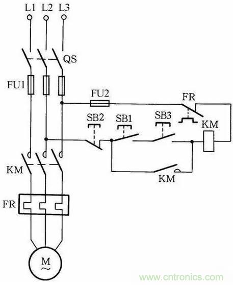 图中SB2为停止按钮,在停止时,按动SB2的时间要长一点。否则,手松开按钮后,接触器又吸合,使电动机继续运行。这是因为电源电压虽被切断,但由于惯性的作用,电动机转子仍然转动,其定子绕组会产生感应电动势,一旦停止按钮很快复位,感应电动势直接加在接触器线圈上,使其再次吸合,电动机继续运转。