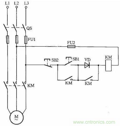 因为启动电流较大,所以这种线路只适用于操作不频繁的场合。线路中,VD应选用耐压大于700V的二极管,电流要根据交流接触器线圈电流而定。
