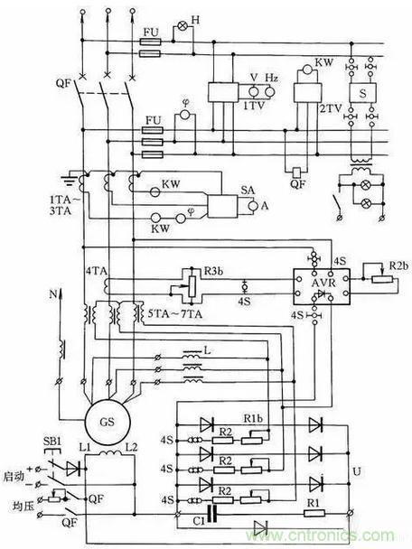 HF-4-81系列发电机控制线路如图15所示,它与T2XV系列小型三相同步发电机配套。同步发电机的励磁系统采用电复合相复励调压。发电机端电压经线性电抗器L移相,然后与发电机负荷电路中的电流互感器5TA~7TA二次电压合成,经三相桥式整流器整流后,供发电机GS励磁自动调压。