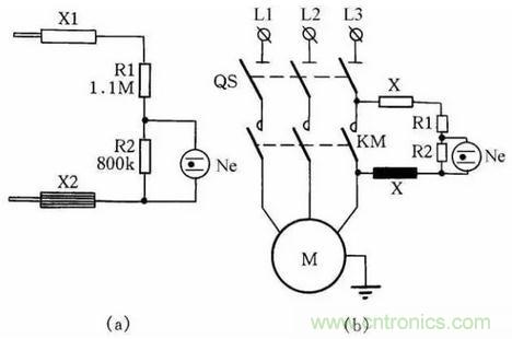 如果绝缘电阻合乎标准(即绝缘电阻值大于0.5MΩ),则泄漏电流很小时,在R2上的电压降小于氖泡的点燃电压,Ne不亮;当任意两相或三相同时对机壳的绝缘电阻降低时,泄漏电流大增,使氖泡Ne点燃,从而可判定绝缘不合格。