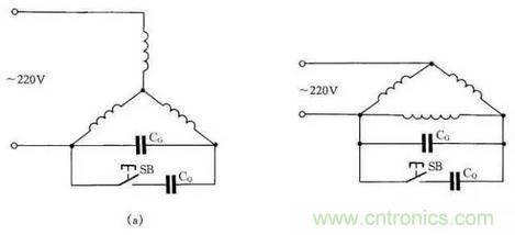 如图19所示:图(a)为Y形接法电动机连接方法,图(b)为△形接法电动机连接方法。为了提高启动转矩,将启动电容CQ在启动时接入线路中,在启动完毕后退出。