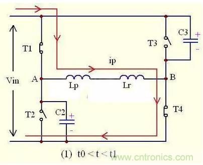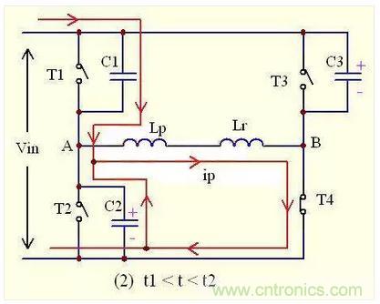 如上图,此时T1与T4同时导通,T2与T3同时关断,原边电流的流向是T1—Lp—Lk—T4,如图所示。