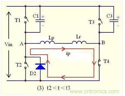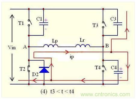 如上图,此时T2与T3同时导通,T1与T4同时关断,原边电流ip的流向是T3—Lk—Lp—T2,如图所示。