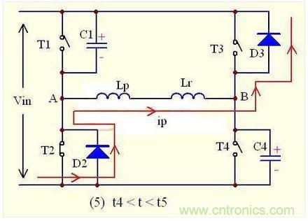 如图所示,在t5时刻之前,T3已经导通,在t5时刻原边电流ip已经下降到0,由于没有了电流,所以D2,D3自然关断。