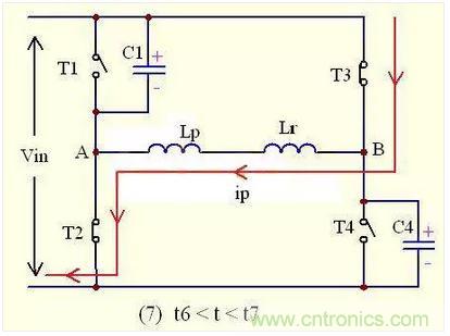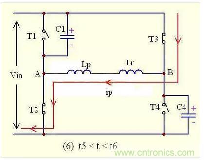 在t5-t6的时间内,副边的二极管D1,D2还是同时导通流过电流,将副边绕组短路,阻断输出电感反射到初级的途径,此时的负载电流还是由次级电感与输出电容提供;同时,由于原边的T2,T3已经导通,原边电流ip流过T3--Lr--T2,又因为Lr很小,所以原边电流ip就会反向急剧增大。