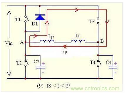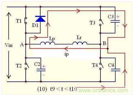 由于T3的关断,原边电流ip突然失去通路,但由电感的原理我们知道,原边电流不允许突变,需要维持原来的方向,以一定的速率减少。所以,原边电流ip会对C3充电,使C3两端的电压慢慢往上升,同时C4开始放电。即 ip(t)=-I2sinω(t-t9)