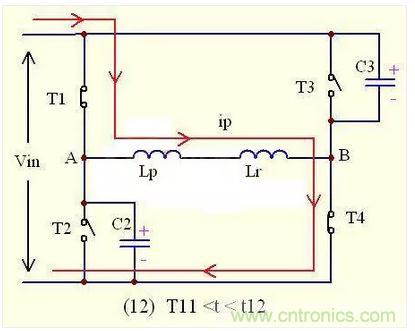 在t11-t12的时间内,副边的二极管D1,D2还是同时导通流过电流,将副边绕组短路,阻断输出电感反射到初级的途径,此时的负载电流还是由次级电感与输出电容提供;同时,由于原边的T1,T4已经导通,原边电流ip流过T1--Lr—T4,又因为Lr很小,所以原边电流ip就会正向急剧增大。