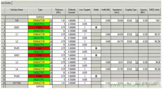 由上面的分析知道,PCB板的叠层设置和信号的耦合以及阻抗计算都有着密切的关系,所以在开始PCB设计之前必须进行叠层设计,然后进行信号的阻抗计算。在本设计中的叠层设计见下图:
