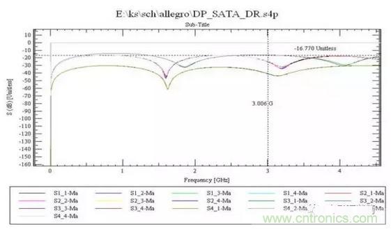 以上的相关步骤设置好以后就可以进行仿真了,allegro可以进行信号的反射仿真、串扰仿真,差分线还要进行眼图分析。当然仿真也分前仿真和后仿真,在利用allegro进行PCB设计的时候还需要结合仿真的结果实时的对设计进行修改以达到符合要求的目的。由于仿真过程复杂,步骤繁琐,在此不一一进行描述, 差分对的布线有两点要注意,一是两条线的长度要尽量一样长,等长是为了保证两个差分信号时刻保持相反极性,减少共模分量。另一是两线的间距(此间距由差分阻抗决定)要一直保持不变,也就是要保持平行。平行的方式有两种,一为两条线走在同一走线层(side-by-side),一为两条线走在上下相邻两层(over-under)。一般以前者side-by-side 实现的方式较多。等距则主要是为了保证两者差分阻抗一致,减少反射。对差分对的布线方式应该要适当的靠近且平行。所谓适当的靠近是因为这间距会影响到差分阻抗(differential impedance)的值, 此值是设计差分对的重要参数。需要平行也是因为要保持差分阻抗的一致性。若两线忽远忽近, 差分阻抗就会不一致, 就会影响信号完整性(signal integrity)及时间延迟(timing delay)。从仿真的S参数曲线图可以分析差分对的差分阻抗(differential impedance),以及信号完整性。下面给出本设计中的关键信号仿真波形以供加以说明。 从仿真图例图5看到,S11在0-3.0GHz 的频域范围内其最劣化的指标为:-16.770db以下 ,S22(粉红色的曲线)也不劣于-17db。 这说明该差分对的差分阻抗(differential impedance)接近设计指标,信号完整性得到了保证。